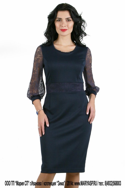 Силуэт прилегающий, достигается с помощью рельефов и вытачек. Кружево используется в отделке по линии талии и в воздушных рукавах, придавая платью нежности и женственности. Завершает образ отделка по линии горловины.