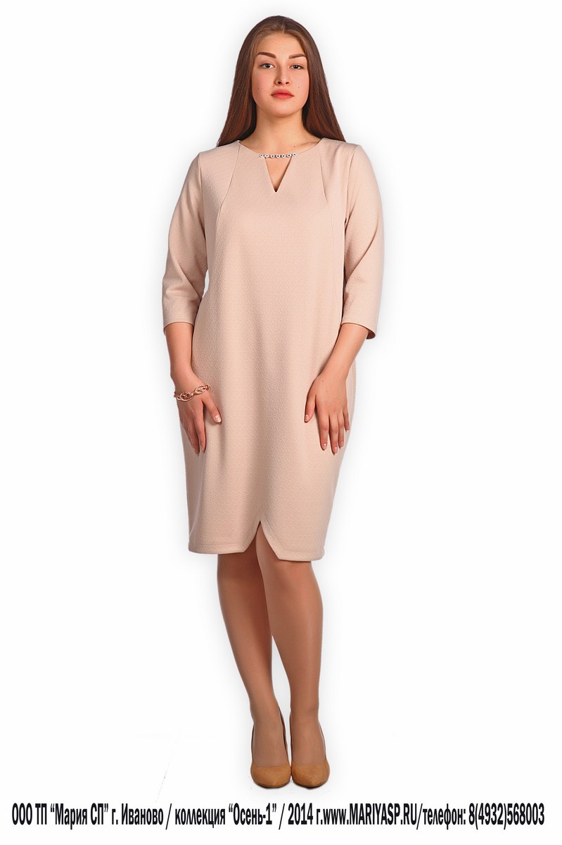 в размерах 48-60 выполнено в трёх цветах. В этом платье следует отметить несколько моментов. Во первых это основа с геометричным жаккардовым переплетением, делающим основу более богатой. Во вторых необычная линия низа, делающая плате более оригинальным и заметным. В третьих отделка по горловине придающая платью элегантность и богатство.
