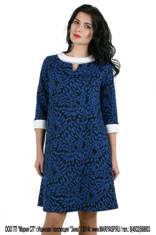 Силует платья трапецевидный. По низу контрастной обтачки горловины нашита декоративная тесьма состоящая из страз.