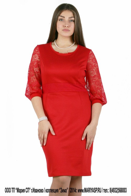 Силуэт прилегающий, достигается с помощью рельефов и вытачек. Кружево используется в отделке по линии талии и в воздушных рукавах, придавая платью нежности и женственности. Завершает образ отделка по линии горловины.
