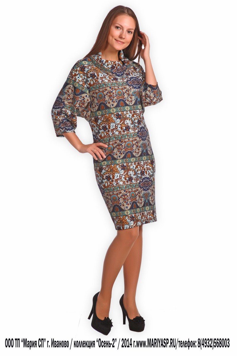 выполнено в размерах 44-54 в двух материалах. Отличаются два платья не только по цвету, но и по материалу. Первый вариант, это модный осенний принт нанесённый на мягкую основу (лакоста), а второй, это трикотаж с жаккардовым рисунком. Конструкция платья уже проверена на продажах прошлых сезонов.