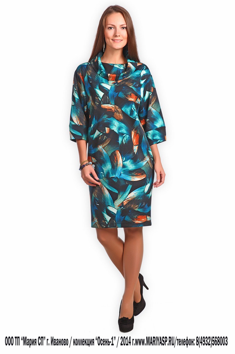 выполнено в размерах 44-54 в двух материалах. Отличаются два платья не только по цвету, но и по материалу. Первый вариант, это модный осенний принт нанесённый на мягкую основу (лакоста), а второй, это трикотаж с жаккардовым рисунком. Конструкция платья уже проверена на продажах прошлых сезонов.
